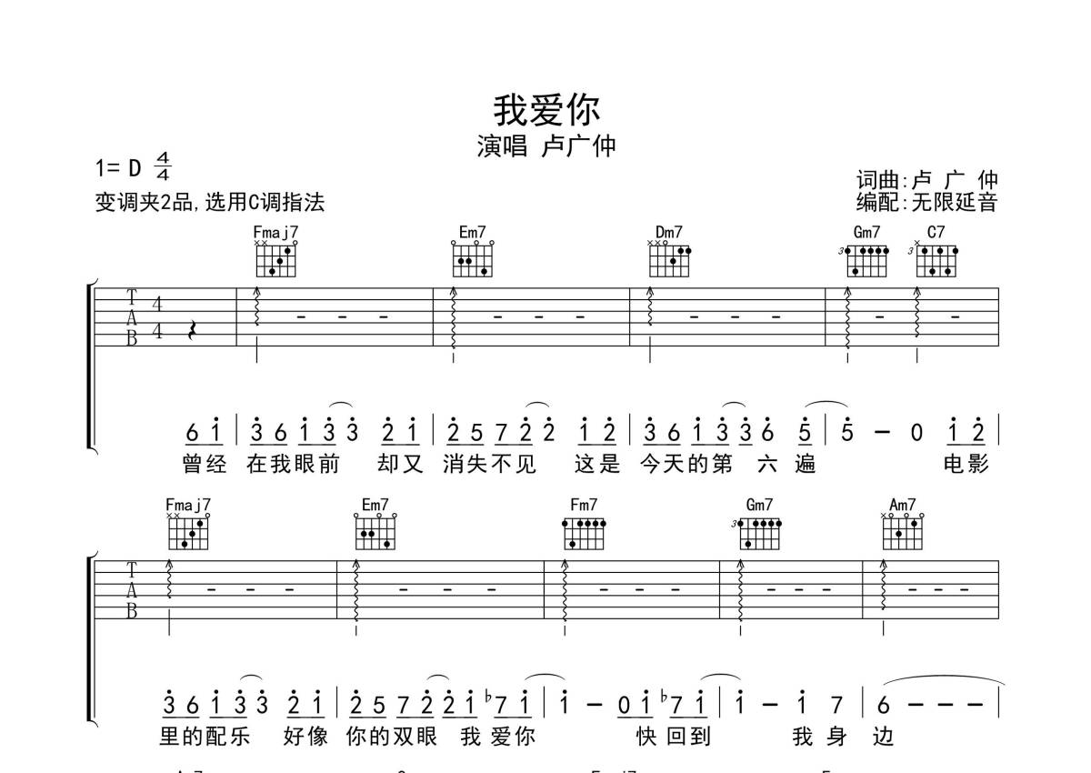 卢广仲《我爱你》吉他谱 - C调弹唱六线谱