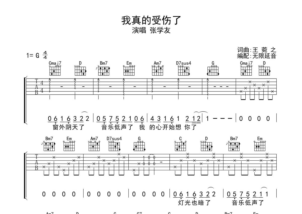 《我真的受伤了》是张学友演唱的一首歌曲,拍号为4/4拍,歌曲原调为C调,本吉他谱采用的是C调指法编配,演奏时不需要使用变调夹即为原调,这份吉他谱共有两张高清图谱,图谱由 @无限延音 编配上传,图谱使用六线谱编配,包含吉他和弦指法、简谱以及歌词部分,使用这份我真的受伤了吉他谱,可以让你更加方便地掌握这首歌曲的弹唱技巧,快来尝试吧。