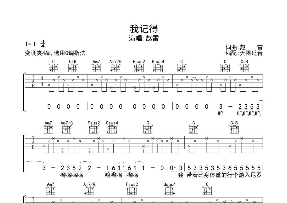 《我记得》是赵雷演唱的一首歌曲,拍号为4/4拍,歌曲原调为E调,但由于原调指法比较难,为了方便弹奏,本吉他谱采用的是C调指法编配,变调夹4品弹奏即为原调,当然也可以根据自己的音域改变变调夹位置,或者通过改变和弦调性,以方便自己弹奏,这份吉他谱共有四张高清图谱,图谱由 @无限延音 编配上传,图谱使用六线谱编配,包含吉他和弦指法、简谱以及歌词部分,使用这份我记得吉他谱,可以让你更加方便地掌握这首歌曲的弹唱技巧,快来尝试吧。
