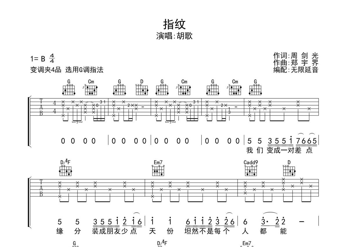 《指纹》是胡歌演唱的一首歌曲,拍号为4/4拍,歌曲原调为B调,但由于原调指法比较难,为了方便弹奏,本吉他谱采用的是G调指法编配,变调夹4品弹奏即为原调,当然也可以根据自己的音域改变变调夹位置,或者通过改变和弦调性,以方便自己弹奏,这份吉他谱共有两张高清图谱,图谱由 @无限延音 编配上传,图谱使用六线谱编配,包含吉他和弦指法、简谱以及歌词部分,使用这份指纹吉他谱,可以让你更加方便地掌握这首歌曲的弹唱技巧,快来尝试吧。