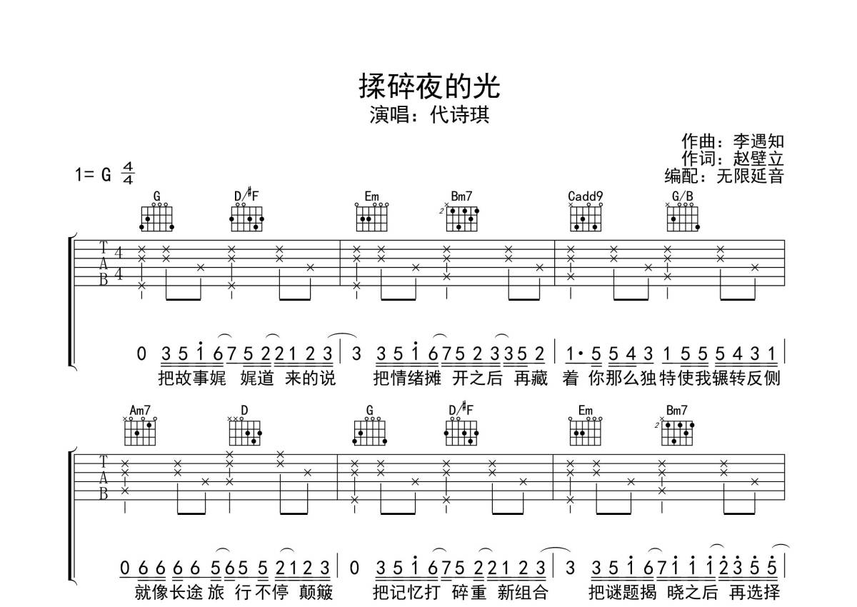 代诗琪《揉碎夜的光》吉他谱 - G调弹唱六线谱