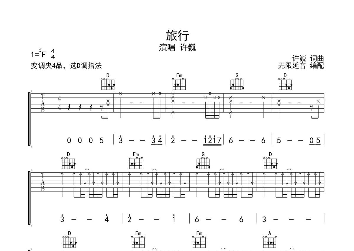 许巍《旅行》吉他谱 - D调弹唱六线谱