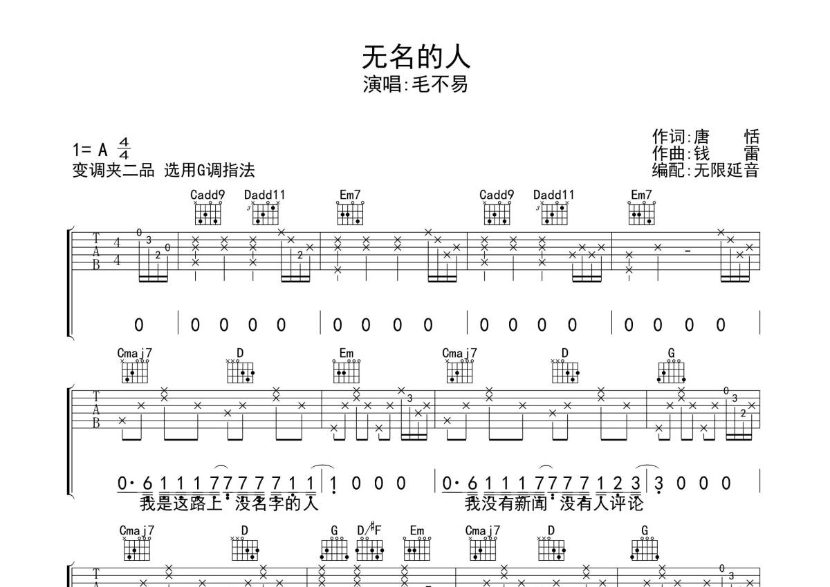 毛不易《无名的人》吉他谱 - G调弹唱六线谱