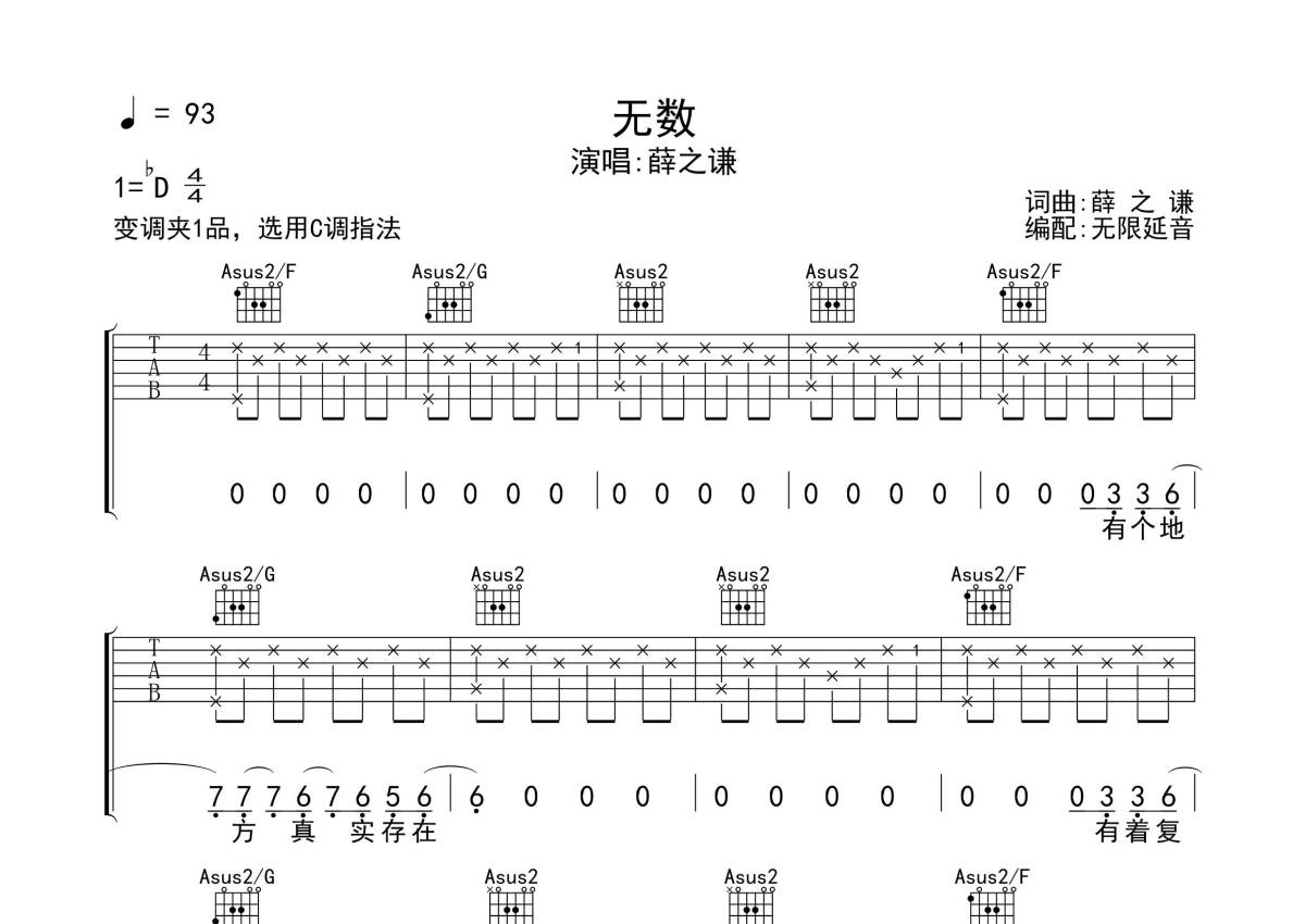 《无数》是薛之谦演唱的一首歌曲,拍号为4/4拍,歌曲速度为每分钟93拍,歌曲原调为Db调,但由于原调指法比较难,为了方便弹奏,本吉他谱采用的是C调指法编配,变调夹1品弹奏即为原调,当然也可以根据自己的音域改变变调夹位置,或者通过改变和弦调性,以方便自己弹奏,这份吉他谱共有五张高清图谱,图谱由 @无限延音 编配上传,图谱使用六线谱编配,包含吉他和弦指法、简谱以及歌词部分,使用这份无数吉他谱,可以让你更加方便地掌握这首歌曲的弹唱技巧,快来尝试吧。