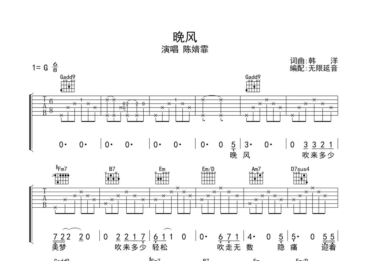 陈婧霏《晚风》吉他谱 - G调弹唱六线谱