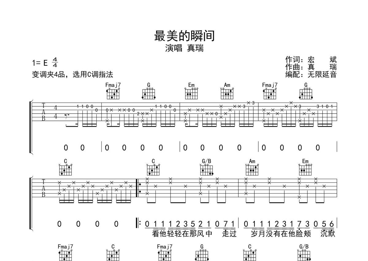 《最美的瞬间》是真瑞演唱的一首歌曲,拍号为4/4拍,歌曲原调为E调,但由于原调指法比较难,为了方便弹奏,本吉他谱采用的是C调指法编配,变调夹4品弹奏即为原调,当然也可以根据自己的音域改变变调夹位置,或者通过改变和弦调性,以方便自己弹奏,这份吉他谱共有两张高清图谱,图谱由 @无限延音 编配上传,图谱使用六线谱编配,包含吉他和弦指法、简谱以及歌词部分,使用这份最美的瞬间吉他谱,可以让你更加方便地掌握这首歌曲的弹唱技巧,快来尝试吧。