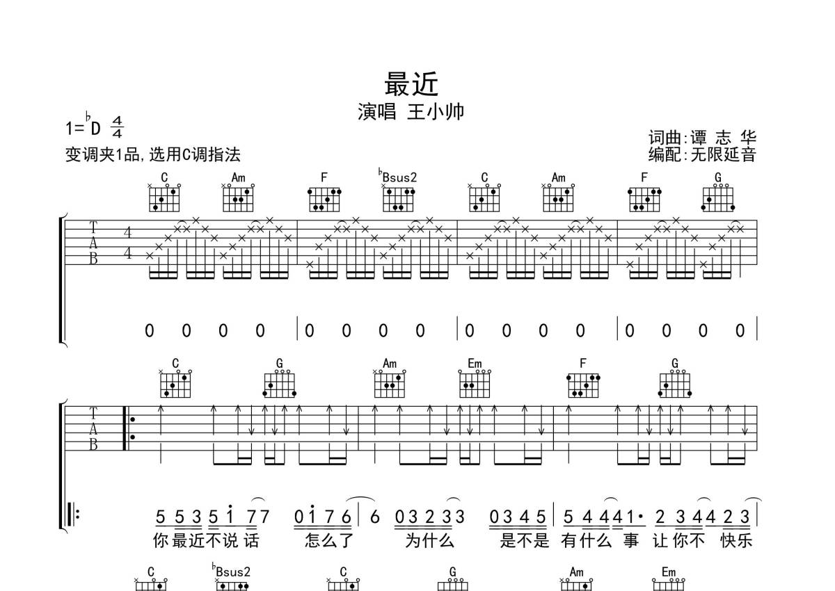《最近》是王小帅演唱的一首歌曲,拍号为4/4拍,歌曲原调为Db调,但由于原调指法比较难,为了方便弹奏,本吉他谱采用的是C调指法编配,变调夹1品弹奏即为原调,当然也可以根据自己的音域改变变调夹位置,或者通过改变和弦调性,以方便自己弹奏,这份吉他谱共有两张高清图谱,图谱由 @无限延音 编配上传,图谱使用六线谱编配,包含吉他和弦指法、简谱以及歌词部分,使用这份最近吉他谱,可以让你更加方便地掌握这首歌曲的弹唱技巧,快来尝试吧。