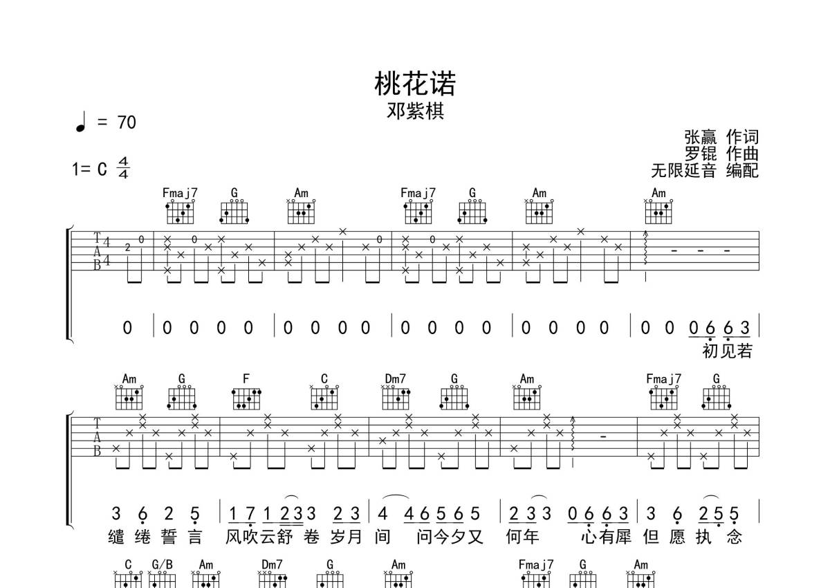 《桃花诺》是邓紫棋演唱的一首歌曲,歌曲原调为C调,本吉他谱采用的是C调指法编配,这份吉他谱共有两张高清图谱,图谱由 @无限延音 编配上传,图谱使用六线谱编配,包含吉他和弦指法、简谱以及歌词部分,使用这份桃花诺吉他谱,可以让你更加方便地掌握这首歌曲的弹唱技巧,快来尝试吧。