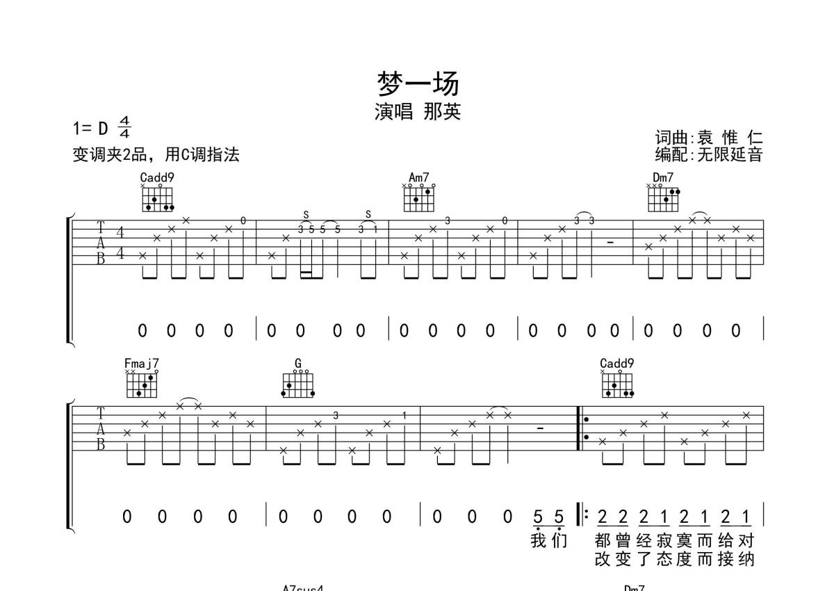 《梦一场》是那英演唱的一首歌曲,歌曲原调为D调,但由于原调指法比较难,为了方便弹奏,本吉他谱采用的是C调指法编配,变调夹2品弹奏即为原调,当然也可以根据自己的音域改变变调夹位置,或者通过改变和弦调性,以方便自己弹奏,这份吉他谱共有三张高清图谱,图谱由 @无限延音 编配上传,图谱使用六线谱编配,包含吉他和弦指法、简谱以及歌词部分,使用这份梦一场吉他谱,可以让你更加方便地掌握这首歌曲的弹唱技巧,快来尝试吧。