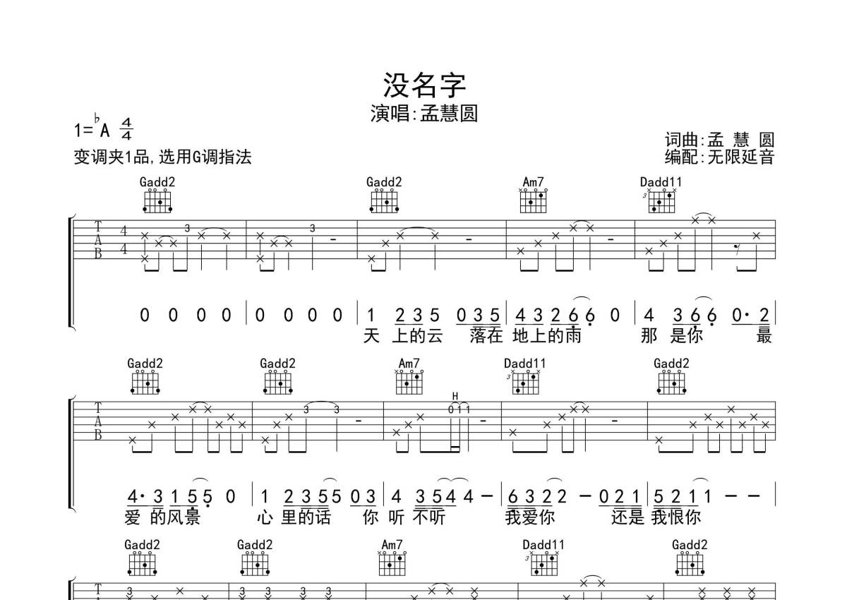 孟慧圆《没名字》吉他谱 - G调弹唱六线谱