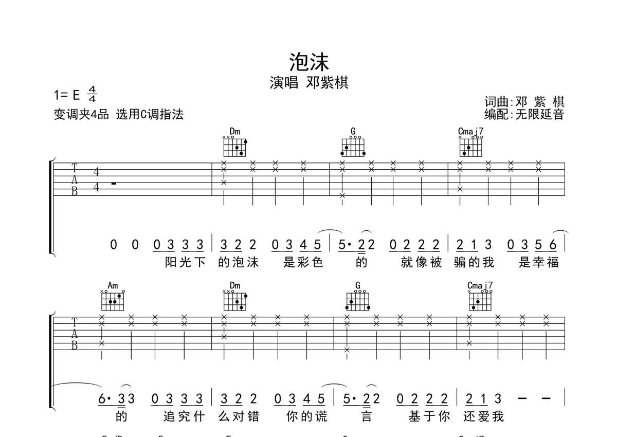 《泡沫》是邓紫棋演唱的一首歌曲,歌曲原调为E调,但由于原调指法比较难,为了方便弹奏,本吉他谱采用的是C调指法编配,变调夹4品弹奏即为原调,当然也可以根据自己的音域改变变调夹位置,或者通过改变和弦调性,以方便自己弹奏,这份吉他谱共有四张高清图谱,图谱由 @无限延音 编配上传,图谱使用六线谱编配,包含吉他和弦指法、简谱以及歌词部分,使用这份泡沫吉他谱,可以让你更加方便地掌握这首歌曲的弹唱技巧,快来尝试吧。