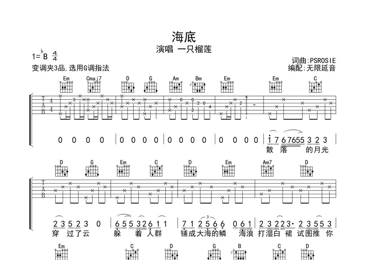 《海底》是一只榴莲演唱的一首歌曲,歌曲原调为Bb调,但由于原调指法比较难,为了方便弹奏,本吉他谱采用的是G调指法编配,变调夹3品弹奏即为原调,当然也可以根据自己的音域改变变调夹位置,或者通过改变和弦调性,以方便自己弹奏,这份吉他谱共有三张高清图谱,图谱由 @无限延音 编配上传,图谱使用六线谱编配,包含吉他和弦指法、简谱以及歌词部分,使用这份海底吉他谱,可以让你更加方便地掌握这首歌曲的弹唱技巧,快来尝试吧。