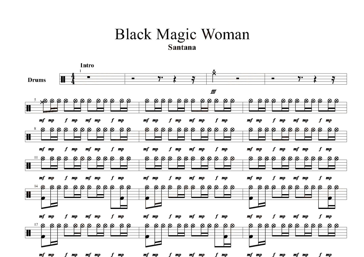 《Black Magic Woman》是Santana演唱的一首歌曲,这份鼓谱共有三张高清图谱,图谱由 @打鼓谱 编配上传,图谱使用五线谱编配,使用这份Black Magic Woman架子鼓谱,你将能够轻松地敲打出这首Santana的Black Magic Woman,快来尝试吧。Santana是成立于美国旧金山的一支乐队,乐队由Bill Graham,Carlos, Dave Brown,Mike Shrieve,Armando Peraza,Carlos Santana,组成。
