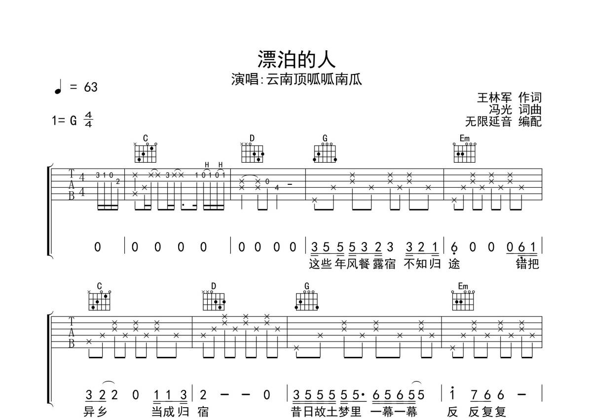 云南顶呱呱南瓜《漂泊的人》吉他谱 - G调弹唱六线谱
