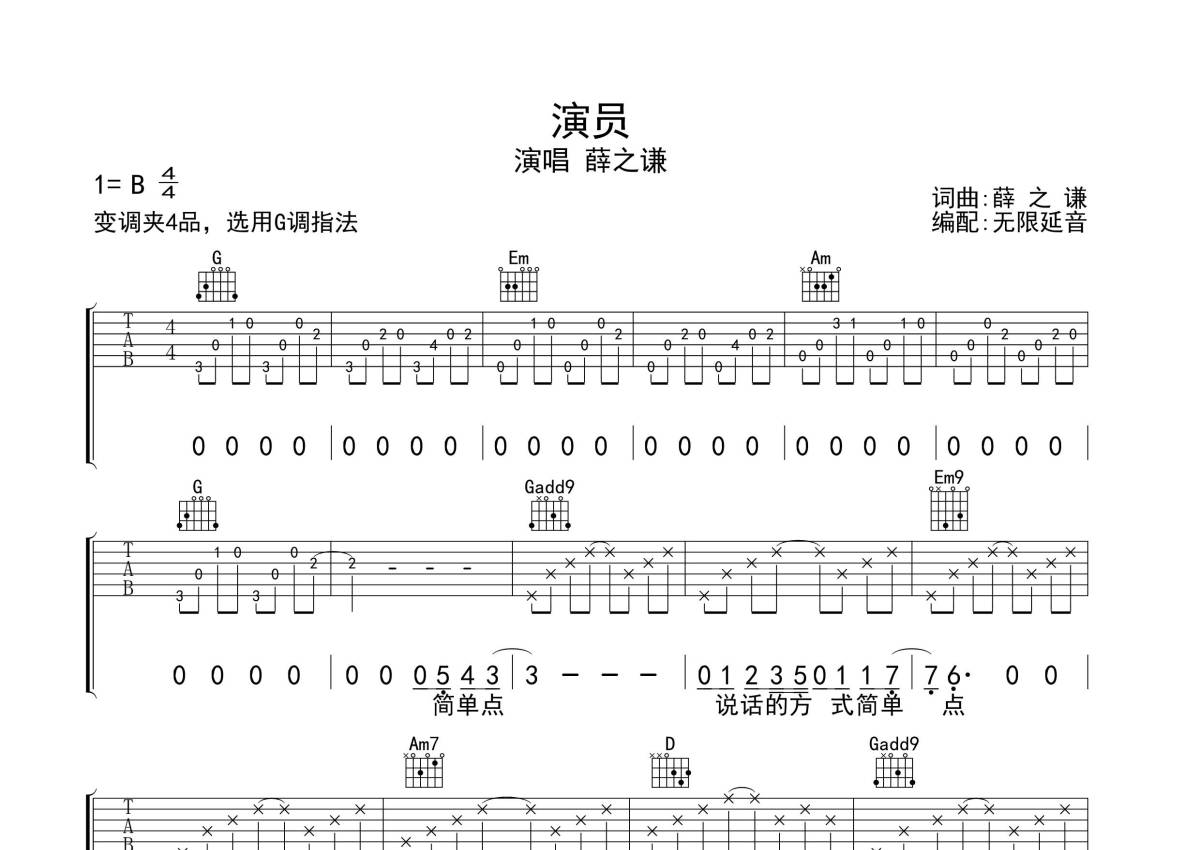 薛之谦《演员》吉他谱 - G调弹唱六线谱