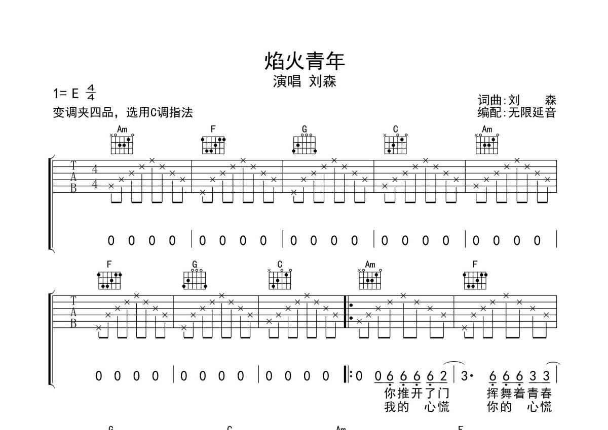 《焰火青年》是刘森演唱的一首歌曲,歌曲原调为E调,但由于原调指法比较难,为了方便弹奏,本吉他谱采用的是C调指法编配,变调夹4品弹奏即为原调,当然也可以根据自己的音域改变变调夹位置,或者通过改变和弦调性,以方便自己弹奏,这份吉他谱共有四张高清图谱,图谱由 @无限延音 编配上传,图谱使用六线谱编配,包含吉他和弦指法、简谱以及歌词部分,使用这份焰火青年吉他谱,可以让你更加方便地掌握这首歌曲的弹唱技巧,快来尝试吧。