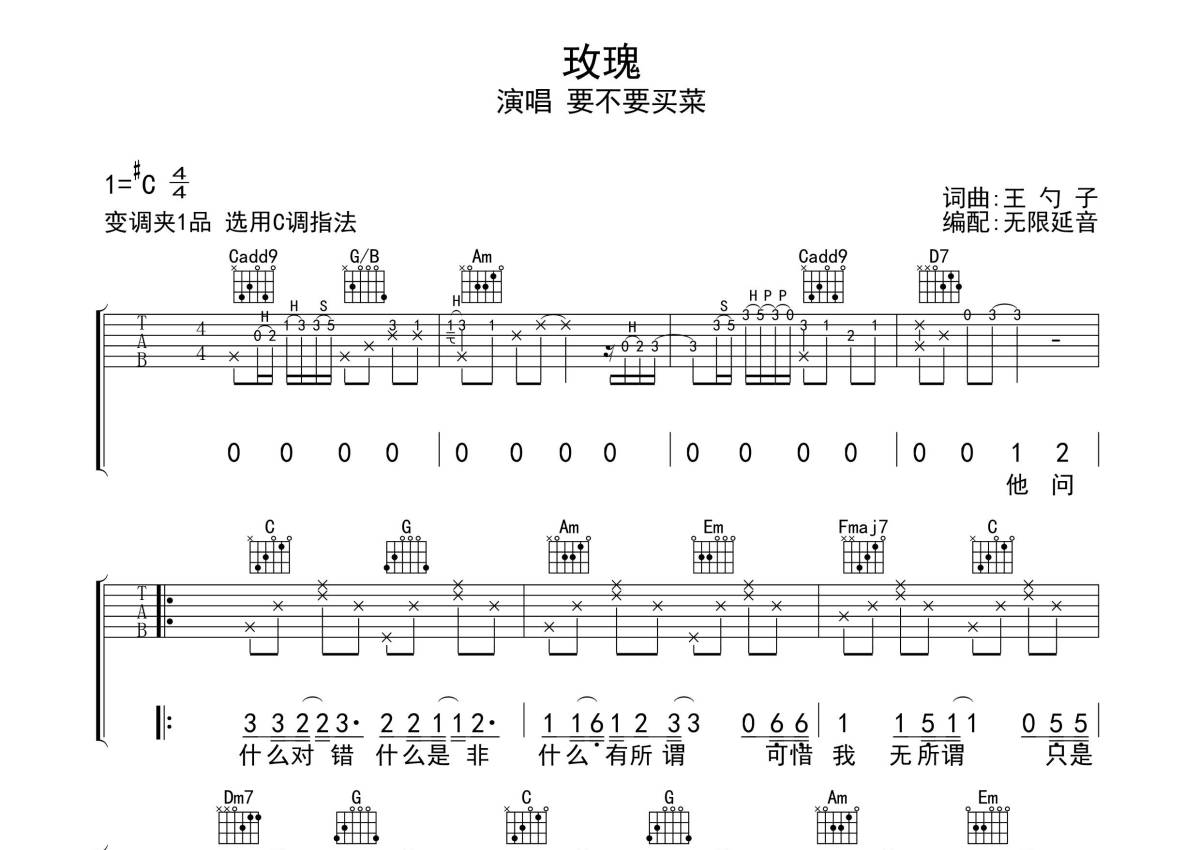 要不要买菜《玫瑰》吉他谱 - C调弹唱六线谱