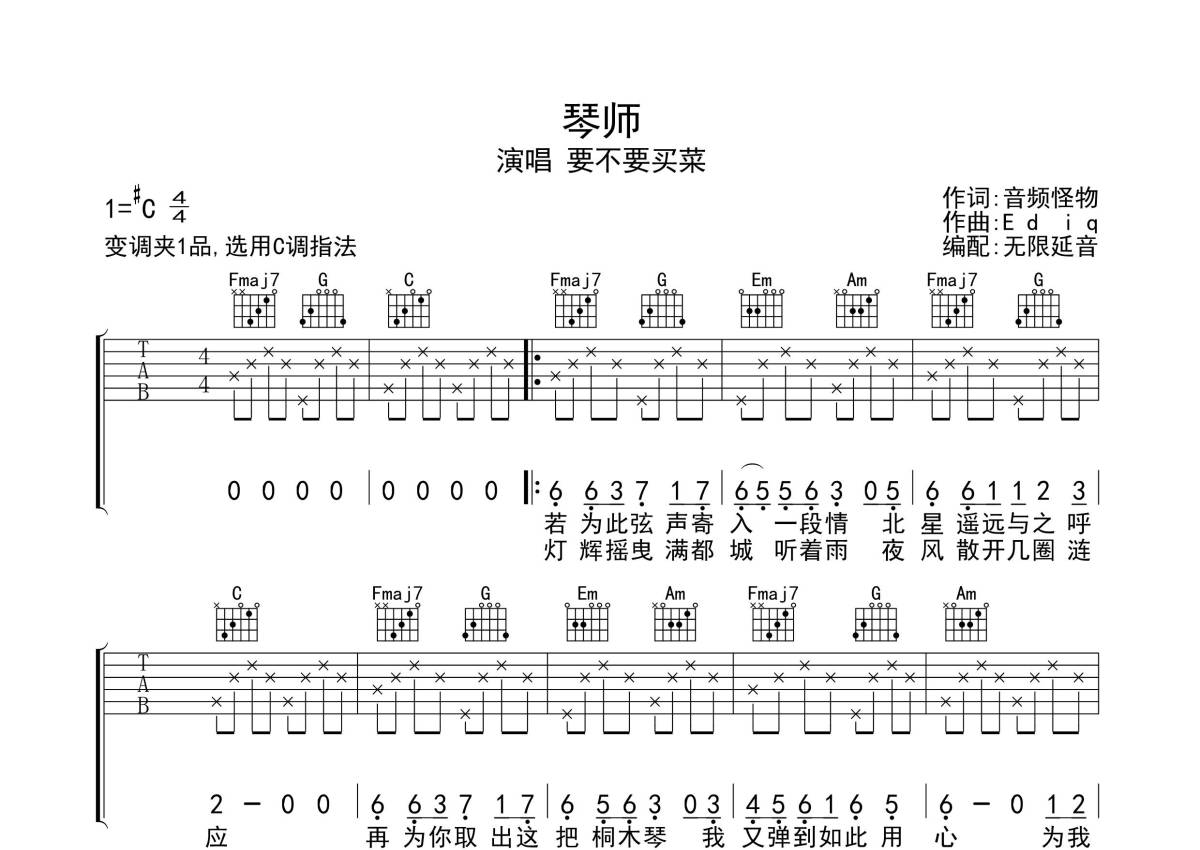《琴师》是要不要买菜演唱的一首歌曲,歌曲原调为Db调,但由于原调指法比较难,为了方便弹奏,本吉他谱采用的是C调指法编配,变调夹1品弹奏即为原调,当然也可以根据自己的音域改变变调夹位置,或者通过改变和弦调性,以方便自己弹奏,这份吉他谱共有三张高清图谱,图谱由 @无限延音 编配上传,图谱使用六线谱编配,包含吉他和弦指法、简谱以及歌词部分,使用这份琴师吉他谱,可以让你更加方便地掌握这首歌曲的弹唱技巧,快来尝试吧。
