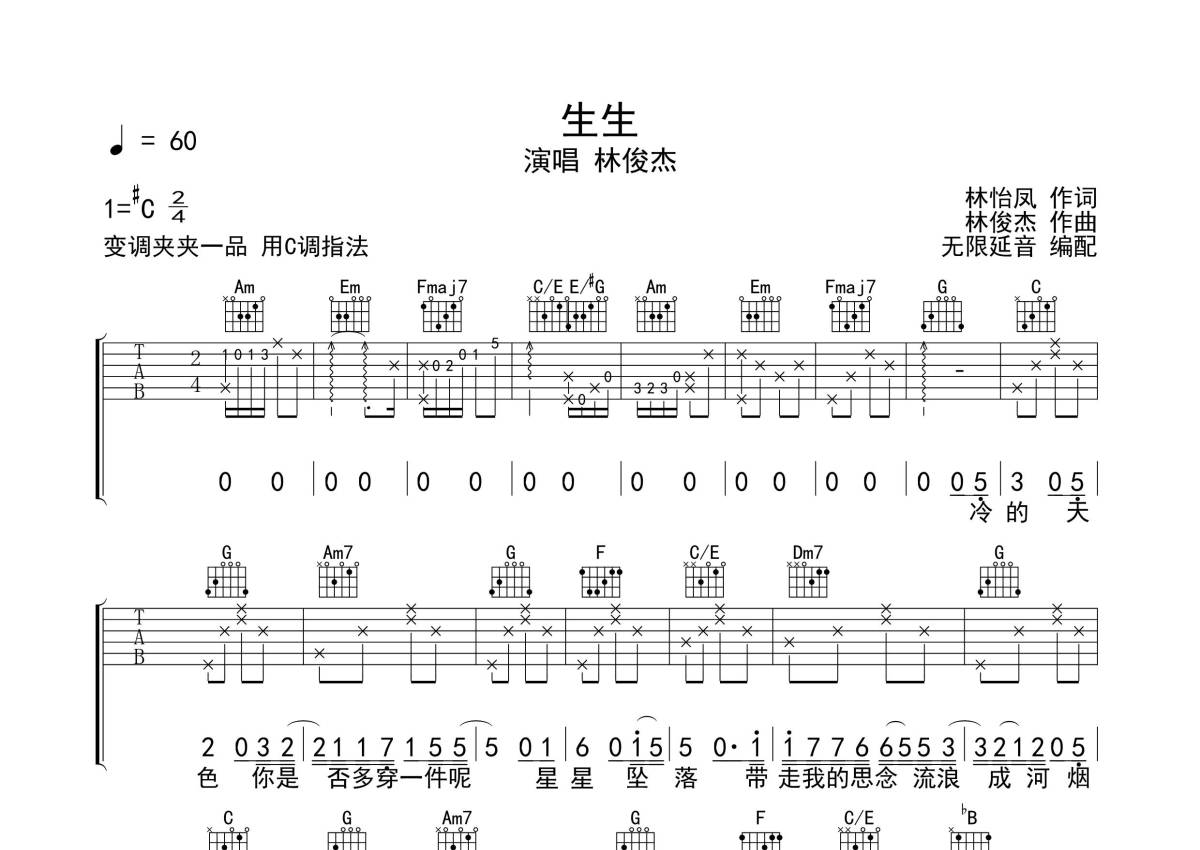 林俊杰《生生》吉他谱 - C调弹唱六线谱