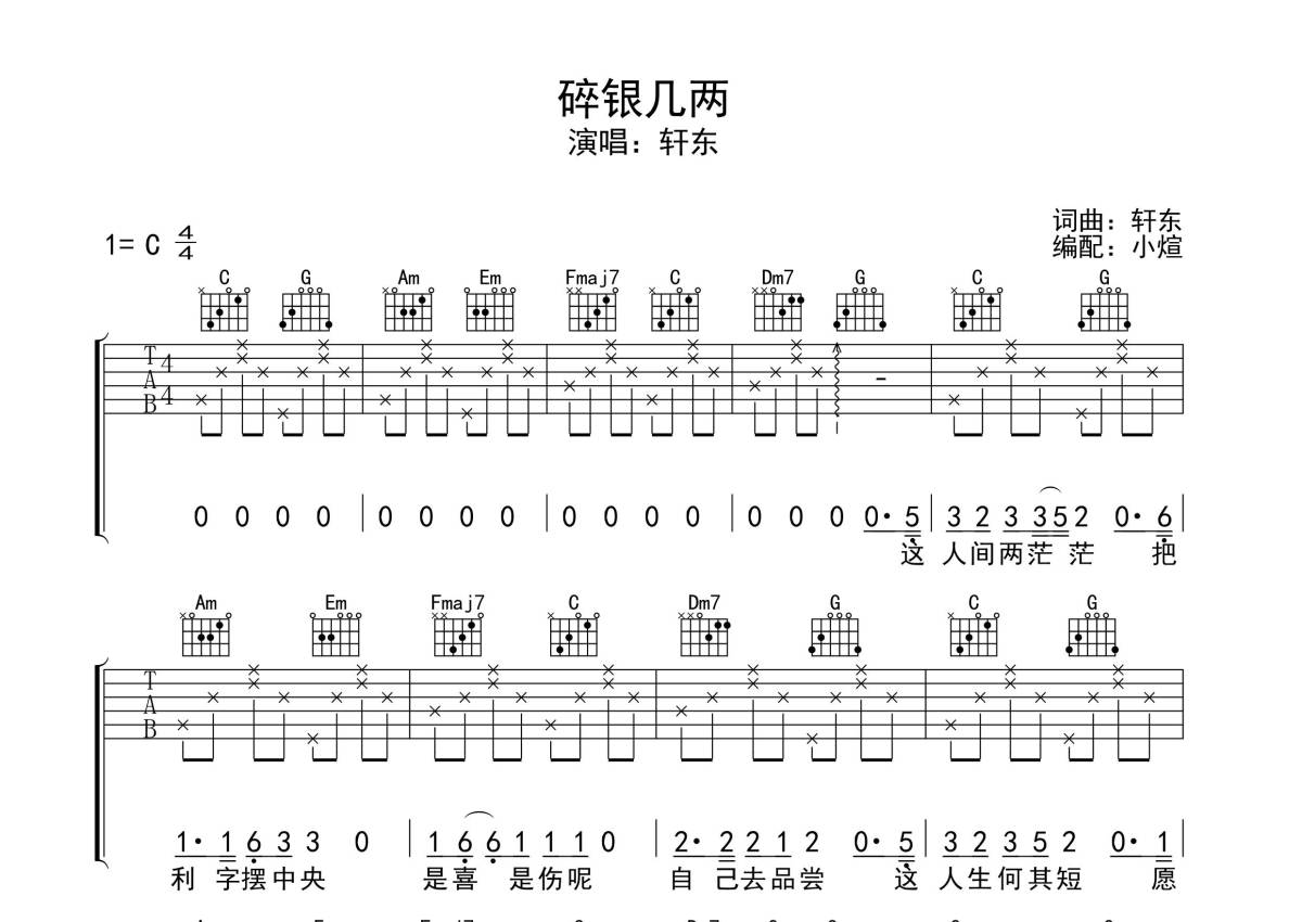 轩东《碎银几两》吉他谱 - C调弹唱六线谱