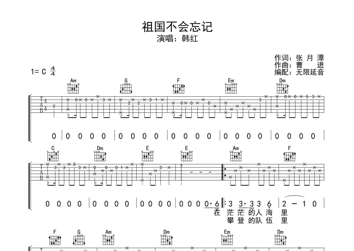 韩红《祖国不会忘记》吉他谱 - C调弹唱六线谱