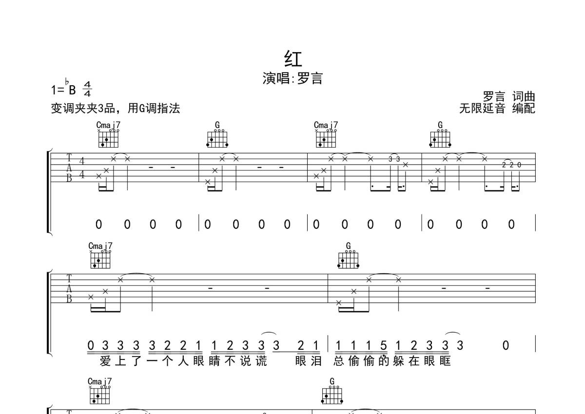 《红》是罗言演唱的一首歌曲,歌曲原调为Bb调,但由于原调指法比较难,为了方便弹奏,本吉他谱采用的是G调指法编配,变调夹3品弹奏即为原调,当然也可以根据自己的音域改变变调夹位置,或者通过改变和弦调性,以方便自己弹奏,这份吉他谱共有三张高清图谱,图谱由 @无限延音 编配上传,图谱使用六线谱编配,包含吉他和弦指法、简谱以及歌词部分,使用这份红吉他谱,可以让你更加方便地掌握这首歌曲的弹唱技巧,快来尝试吧。