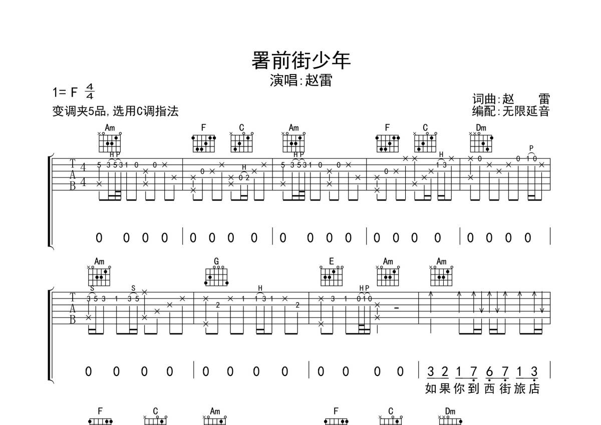 《署前街少年》是赵雷演唱的一首歌曲,歌曲原调为F调,但由于原调指法比较难,为了方便弹奏,本吉他谱采用的是C调指法编配,变调夹5品弹奏即为原调,当然也可以根据自己的音域改变变调夹位置,或者通过改变和弦调性,以方便自己弹奏,这份吉他谱共有四张高清图谱,图谱由 @无限延音 编配上传,图谱使用六线谱编配,包含吉他和弦指法、简谱以及歌词部分,使用这份署前街少年吉他谱,可以让你更加方便地掌握这首歌曲的弹唱技巧,快来尝试吧。