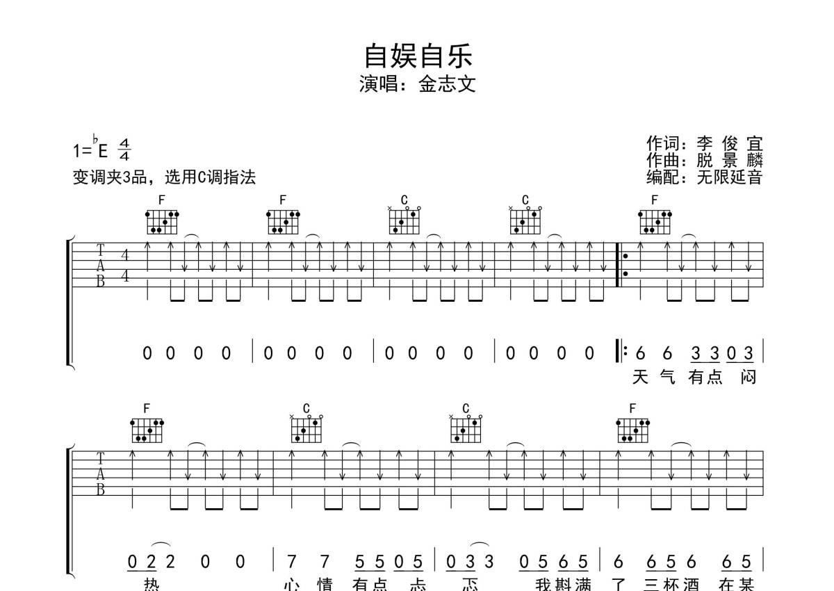 《自娱自乐》是金志文演唱的一首歌曲,歌曲原调为Eb调,但由于原调指法比较难,为了方便弹奏,本吉他谱采用的是G调指法编配,变调夹3品弹奏即为原调,当然也可以根据自己的音域改变变调夹位置,或者通过改变和弦调性,以方便自己弹奏,这份吉他谱共有三张高清图谱,图谱由 @无限延音 编配上传,图谱使用六线谱编配,包含吉他和弦指法、简谱以及歌词部分,使用这份自娱自乐吉他谱,可以让你更加方便地掌握这首歌曲的弹唱技巧,快来尝试吧。