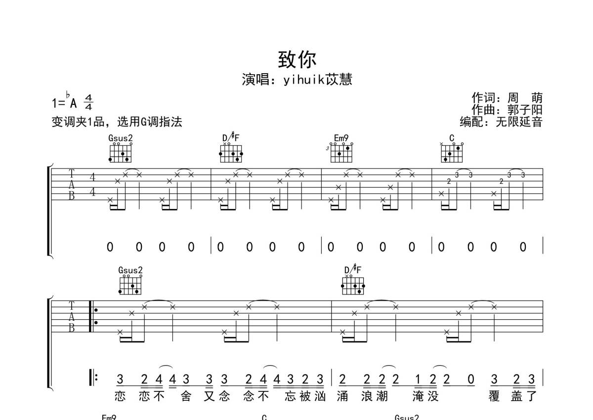 yihuik苡慧《致你》吉他谱 - G调弹唱六线谱