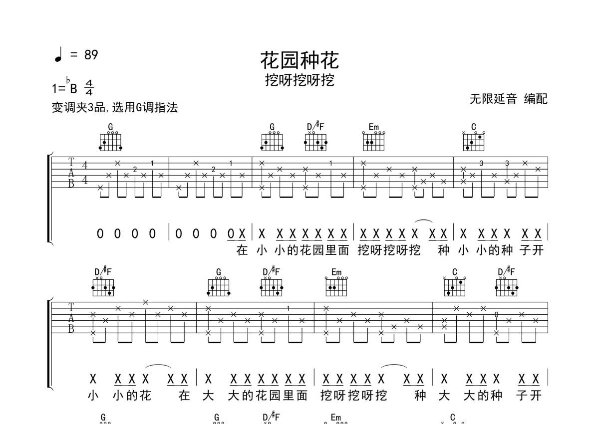 《花园种花》是挖呀挖呀挖演唱的一首歌曲,歌曲原调为Bb调,但由于原调指法比较难,为了方便弹奏,本吉他谱采用的是G调指法编配,变调夹3品弹奏即为原调,当然也可以根据自己的音域改变变调夹位置,或者通过改变和弦调性,以方便自己弹奏,这份吉他谱共有一张高清图谱,图谱由 @无限延音 编配上传,图谱使用六线谱编配,包含吉他和弦指法、简谱以及歌词部分,使用这份花园种花吉他谱,可以让你更加方便地掌握这首歌曲的弹唱技巧,快来尝试吧。