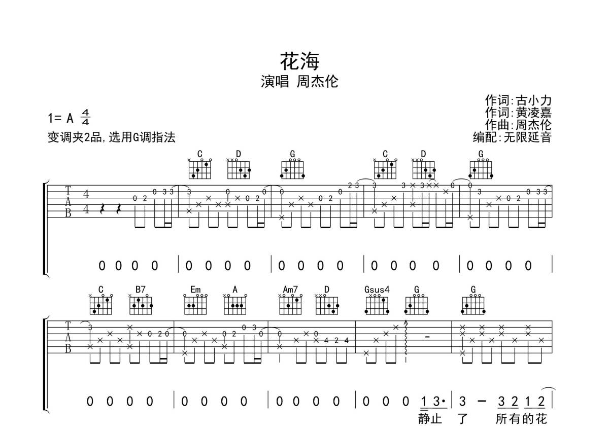 周杰伦《花海》吉他谱 - G调弹唱六线谱