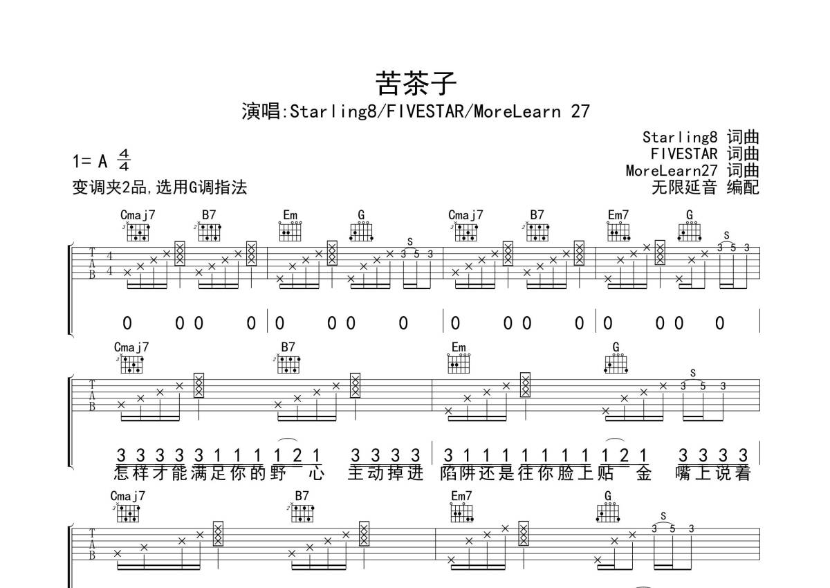 《苦茶子》是Strling8演唱的一首歌曲,歌曲原调为A调,但由于原调指法比较难,为了方便弹奏,本吉他谱采用的是G调指法编配,变调夹2品弹奏即为原调,当然也可以根据自己的音域改变变调夹位置,或者通过改变和弦调性,以方便自己弹奏,这份吉他谱共有四张高清图谱,图谱由 @无限延音 编配上传,图谱使用六线谱编配,包含吉他和弦指法、简谱以及歌词部分,使用这份苦茶子吉他谱,可以让你更加方便地掌握这首歌曲的弹唱技巧,快来尝试吧。