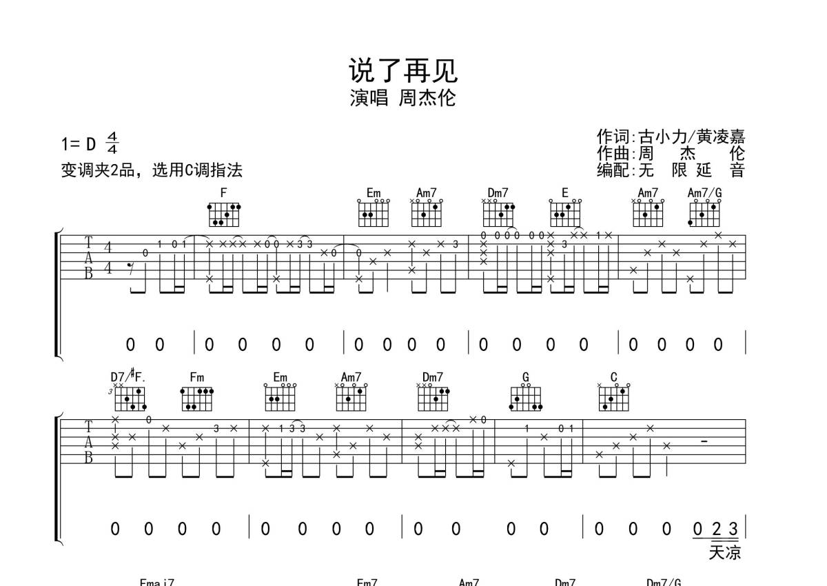 《说了再见》是周杰伦演唱的一首歌曲,歌曲原调为D调,但由于原调指法比较难,为了方便弹奏,本吉他谱采用的是C调指法编配,变调夹2品弹奏即为原调,当然也可以根据自己的音域改变变调夹位置,或者通过改变和弦调性,以方便自己弹奏,这份吉他谱共有三张高清图谱,图谱由 @无限延音 编配上传,图谱使用六线谱编配,包含吉他和弦指法、简谱以及歌词部分,使用这份说了再见吉他谱,可以让你更加方便地掌握这首歌曲的弹唱技巧,快来尝试吧。