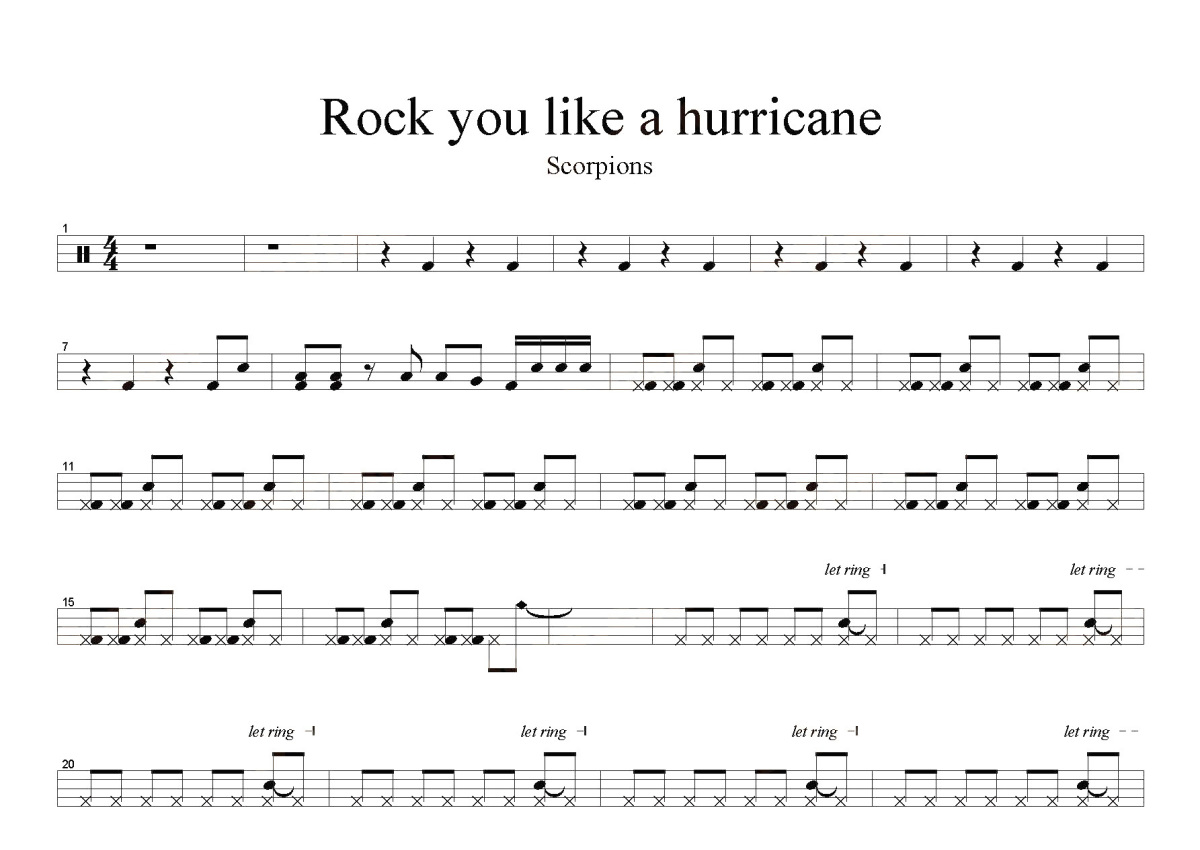 《Rock You Like A Hurricane》是Scorpions演唱的一首歌曲,这份鼓谱共有三张高清图谱,图谱由 @打鼓谱 编配上传,图谱使用五线谱编配,使用这份Rock You Like A Hurricane架子鼓谱,你将能够轻松地敲打出这首Scorpions的Rock You Like A Hurricane,快来尝试吧。《Rock You Like A Hurricane》。蝎子乐队(Scorpions),德国著名的重金属摇滚乐团,70年代初期发迹于汉堡北方的工业重地汉诺威。