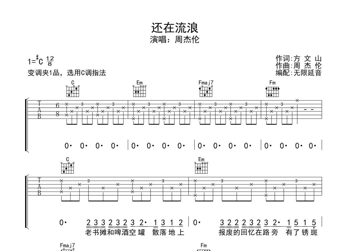 周杰伦《还在流浪》吉他谱 - C调弹唱六线谱