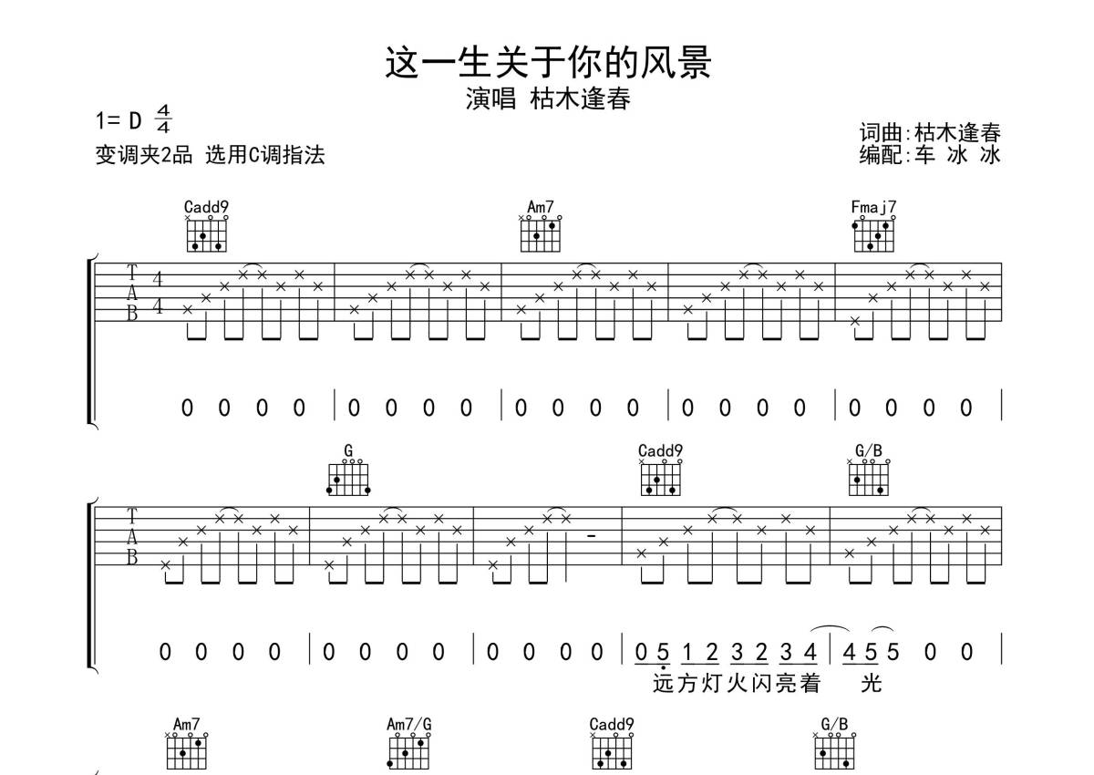 《这一生关于你的风景》是隔壁老樊演唱的一首歌曲,歌曲原调为D调,但由于原调指法比较难,为了方便弹奏,本吉他谱采用的是C调指法编配,变调夹2品弹奏即为原调,当然也可以根据自己的音域改变变调夹位置,或者通过改变和弦调性,以方便自己弹奏,这份吉他谱共有三张高清图谱,图谱由 @无限延音 编配上传,图谱使用六线谱编配,包含吉他和弦指法、简谱以及歌词部分,使用这份这一生关于你的风景吉他谱,可以让你更加方便地掌握这首歌曲的弹唱技巧,快来尝试吧。