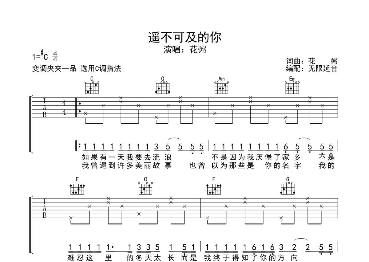 花粥《遥不可及的你》吉他谱 - C调弹唱六线谱