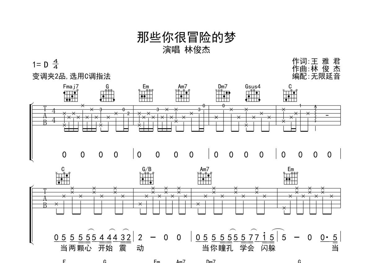 《那些你很冒险的梦》是林俊杰演唱的一首歌曲,歌曲原调为D调,但由于原调指法比较难,为了方便弹奏,本吉他谱采用的是C调指法编配,变调夹2品弹奏即为原调,当然也可以根据自己的音域改变变调夹位置,或者通过改变和弦调性,以方便自己弹奏,这份吉他谱共有三张高清图谱,图谱由 @无限延音 编配上传,图谱使用六线谱编配,包含吉他和弦指法、简谱以及歌词部分,使用这份那些你很冒险的梦吉他谱,可以让你更加方便地掌握这首歌曲的弹唱技巧,快来尝试吧。