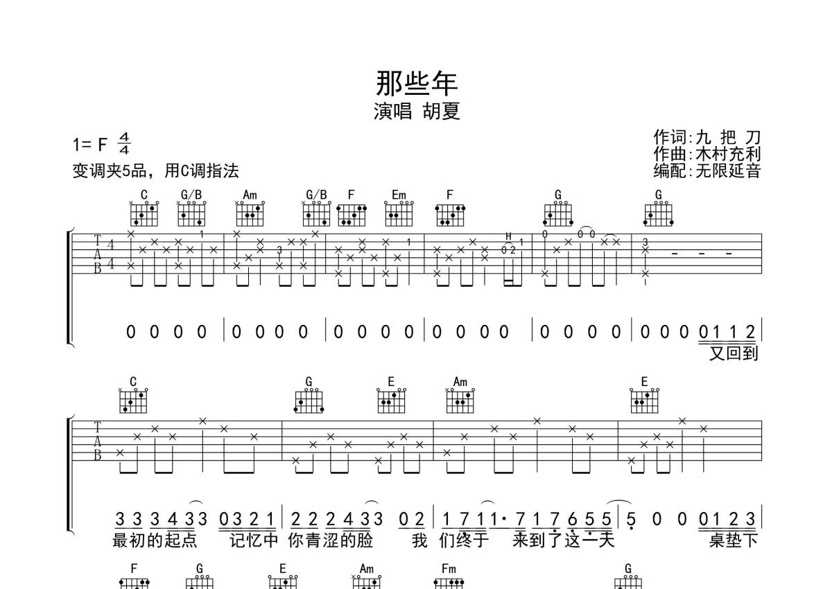 《那些年》是胡夏演唱的一首歌曲,歌曲原调为F调,但由于原调指法比较难,为了方便弹奏,本吉他谱采用的是C调指法编配,变调夹5品弹奏即为原调,当然也可以根据自己的音域改变变调夹位置,或者通过改变和弦调性,以方便自己弹奏,这份吉他谱共有三张高清图谱,图谱由 @无限延音 编配上传,图谱使用六线谱编配,包含吉他和弦指法、简谱以及歌词部分,使用这份那些年吉他谱,可以让你更加方便地掌握这首歌曲的弹唱技巧,快来尝试吧。