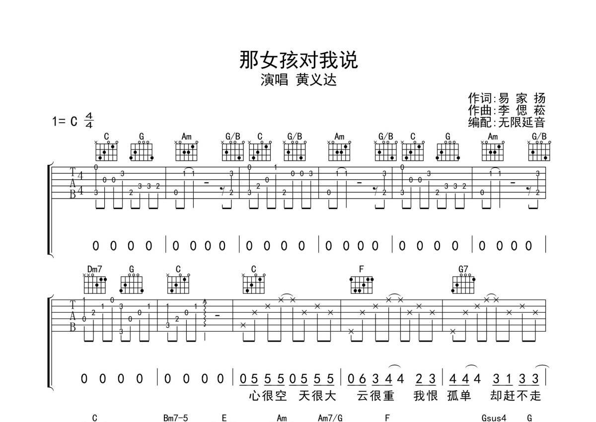 Uu《那女孩对我说》吉他谱 - C调弹唱六线谱