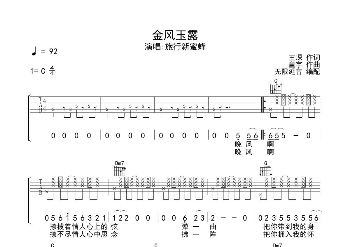 旅行新蜜蜂《金风玉露》吉他谱 - G调弹唱六线谱