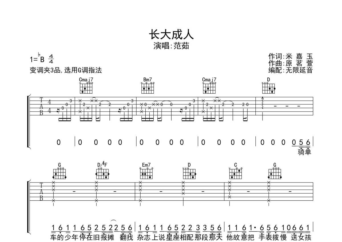 《长大成人》是范茹演唱的一首歌曲,歌曲原调为Bb调,但由于原调指法比较难,为了方便弹奏,本吉他谱采用的是G调指法编配,变调夹3品弹奏即为原调,当然也可以根据自己的音域改变变调夹位置,或者通过改变和弦调性,以方便自己弹奏,这份吉他谱共有三张高清图谱,图谱由 @无限延音 编配上传,图谱使用六线谱编配,包含吉他和弦指法、简谱以及歌词部分,使用这份长大成人吉他谱,可以让你更加方便地掌握这首歌曲的弹唱技巧,快来尝试吧。