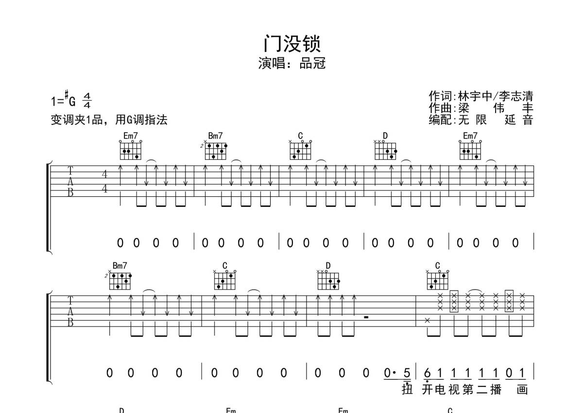 品冠《门没锁》吉他谱 - G调弹唱六线谱