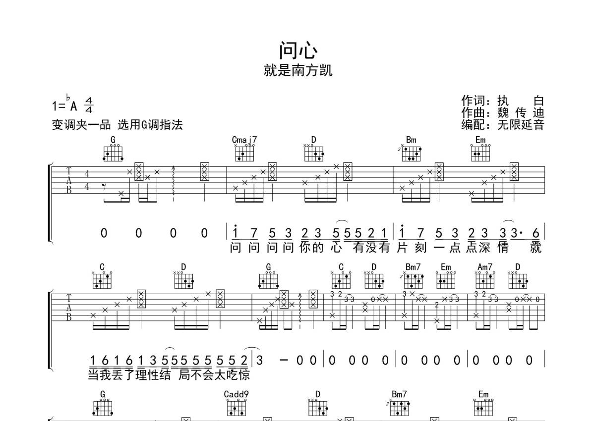 就是南方凯《问心》吉他谱 - G调弹唱六线谱