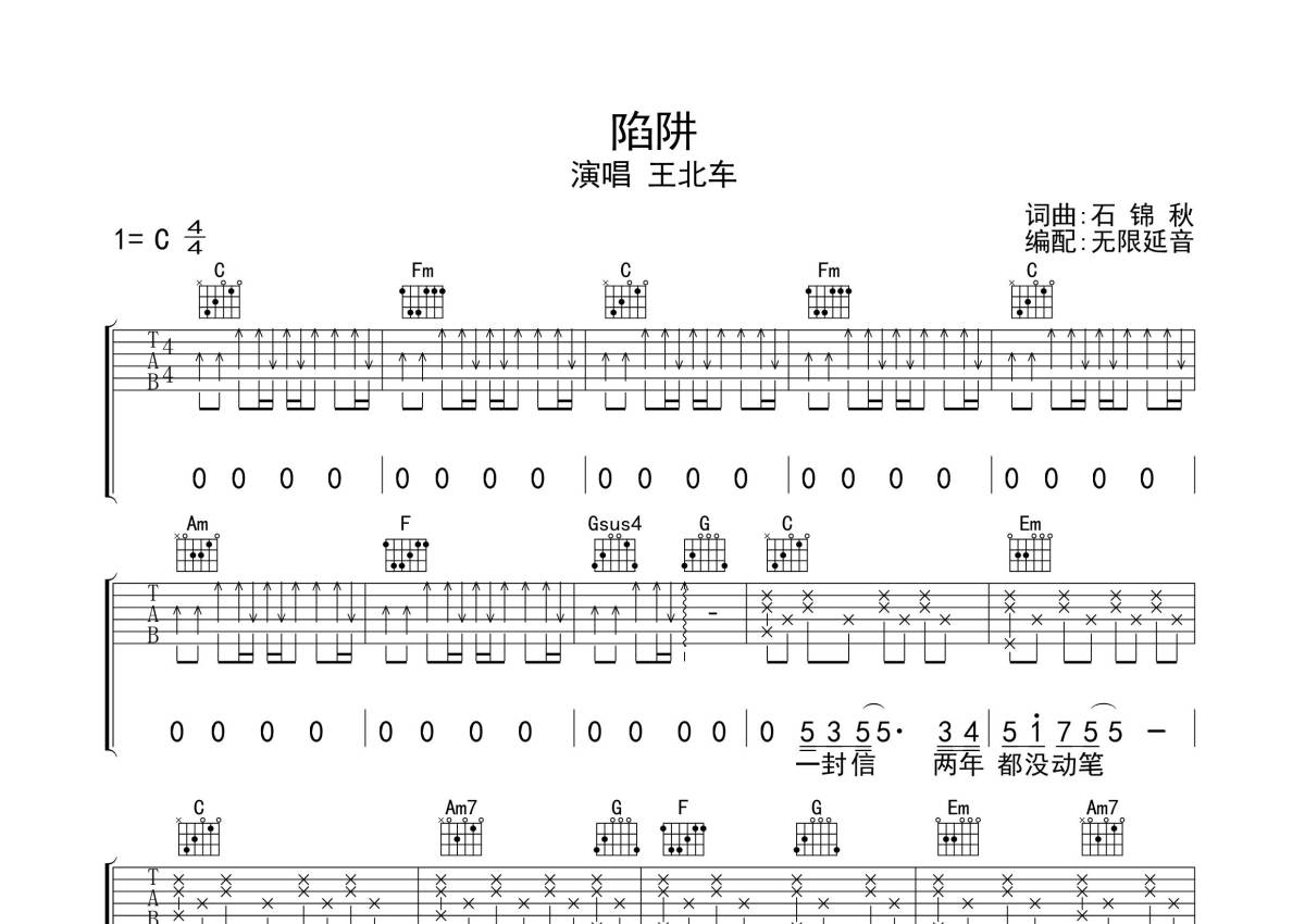 王北车《陷阱》吉他谱 - C调弹唱六线谱