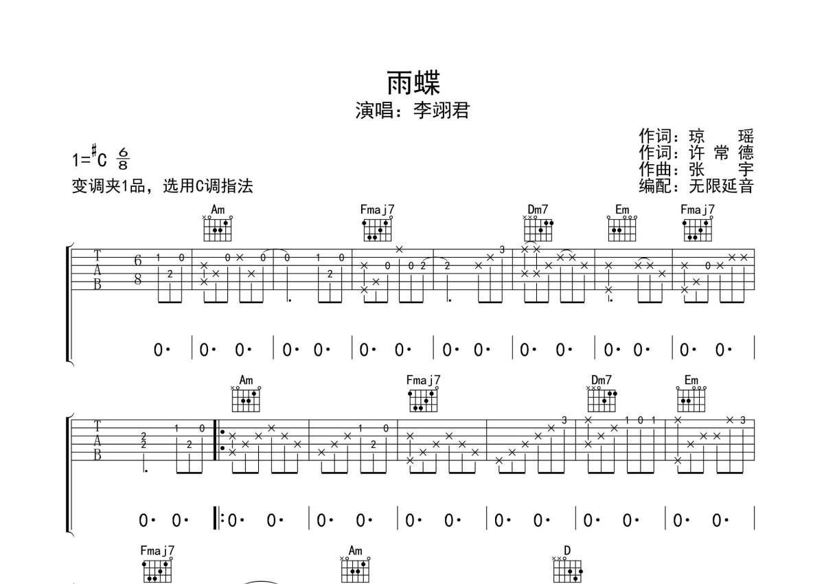 李翊君《雨蝶》吉他谱 - C调弹唱六线谱