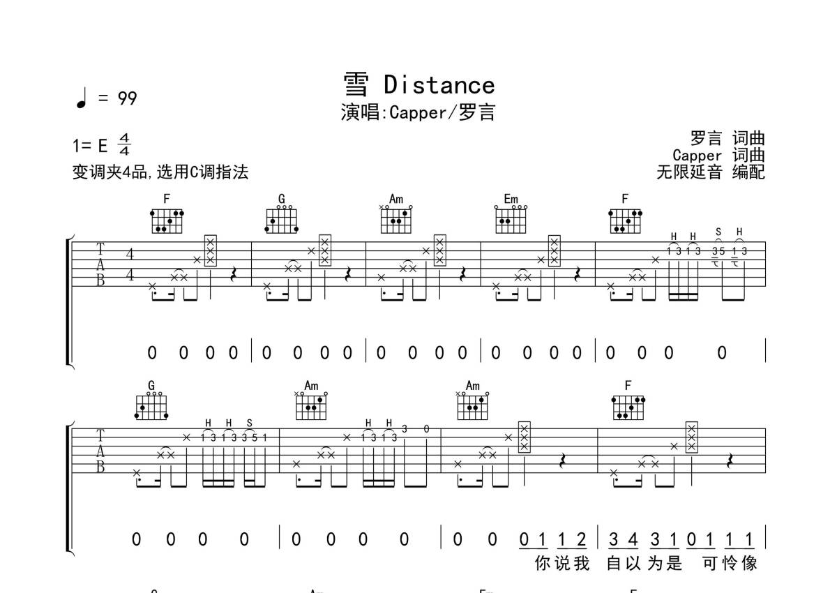 Capper/罗言《雪 Distance》吉他谱 - C调弹唱六线谱