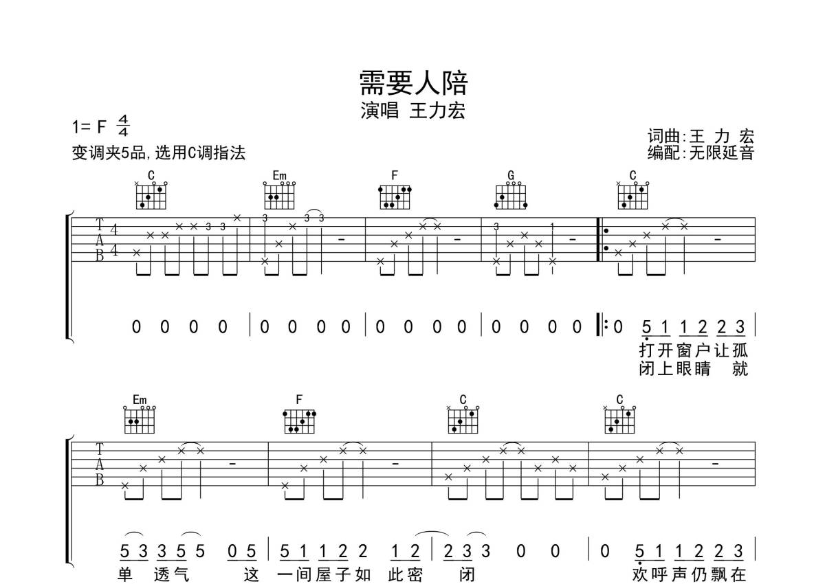 王力宏《需要人陪》吉他谱 - C调弹唱六线谱