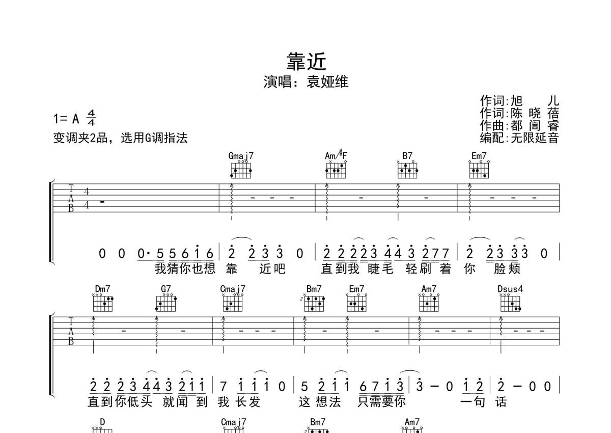 《靠近》是赖仔Morris演唱的一首歌曲,歌曲原调为A调,但由于原调指法比较难,为了方便弹奏,本吉他谱采用的是G调指法编配,变调夹2品弹奏即为原调,当然也可以根据自己的音域改变变调夹位置,或者通过改变和弦调性,以方便自己弹奏,这份吉他谱共有四张高清图谱,图谱由 @无限延音 编配上传,图谱使用六线谱编配,包含吉他和弦指法、简谱以及歌词部分,使用这份靠近吉他谱,可以让你更加方便地掌握这首歌曲的弹唱技巧,快来尝试吧。