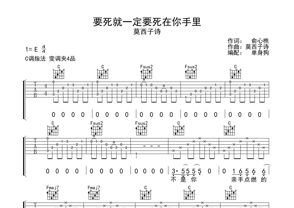 《要死就一定要死在你手里》是莫西子诗演唱的一首歌曲,歌曲原调为E调,但由于原调指法比较难,为了方便弹奏,本吉他谱采用的是C调指法编配,变调夹4品弹奏即为原调,当然也可以根据自己的音域改变变调夹位置,或者通过改变和弦调性,以方便自己弹奏,这份吉他谱共有四张高清图谱,图谱由 @单身狗 编配上传,图谱使用六线谱编配,包含吉他和弦指法、简谱以及歌词部分,使用这份要死就一定要死在你手里吉他谱,可以让你更加方便地掌握这首歌曲的弹唱技巧,快来尝试吧。